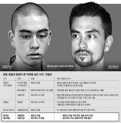 대법원에서는 증거불충분으로 사건을 서울고등법원으로 파기환송하였고, 결국 서울고법에서는 새로운 증거를 찾지 못하여 에드워드 리에 대해 무죄를 선고합니다. 살인범일 수도 있지만 증거가 부족하여 유죄를 확정할 수 없다는 이유에서 였습니다. 재상고심에서도 대법원은 그에게 무죄 판결을 내립니다. 패터슨은 단순흉기 소지로 기소되어 유죄 판결을 받고, 반년 만인 1998년 8월 15일 815 특별사면으로 풀려나게 됩니다.
