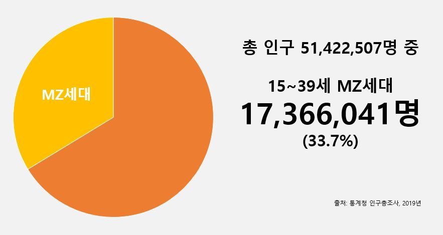 MZ세대란, 밀레니얼(Millennials)의 M과 제네레이션(Generation)의 Z가 합쳐진 말입니다. M세대는 1980년대 초~부터 2000년대 초 출생한 세대로 정보기술(IT)에 능통하며 대학 진학률이 높다는 특징이 있습니다. Z세대는 1990년대 중반~2000년대 초반 출생한 세대로 디지털 환경에서 자란’디지털 네이티브(디지털 원주민)’라는 특징이 있습니다. 통계청에 따르면 이 MZ세대는 2019년 기준 약 1,700만 명으로 국내 인구의 약 34%를 차지한다고 합니다.