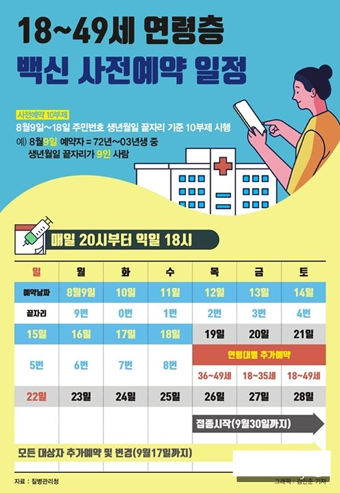 만 18∼49세 성인 1777만 명에 대해 시행되는 코로나 백신접종 예약 방식인데, 주민등록번호 생년월일 끝자리를 사용합니다. 연령층 10부제 예약은 8월 9일∼18일까지 10일간 이뤄집니다. 10부제 사전예약이 끝난 8월 19일∼21일까지는 연령대별로 추가 예약을 받고, 8월 22일부터 9월 17일까지는 생년월일과 관계없이 18∼49세 누구나 예약참여가 가능합니다.