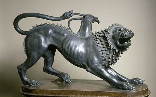 그리스 신화에 등장하는 괴물인데, 영어 표기는 ‘Chimera’입니다. 그리스 신화에서는 카리아와 리키아를 제멋대로 유린하다가 코린트의 용사 벨레로폰에게 살해당합니다. 입에서 불을 내뿜는 이 암컷 괴물은 앞부분은 사자와 비슷하고, 중간 부분은 염소와 비슷하며, 뒷부분은 용과 비슷합니다.
