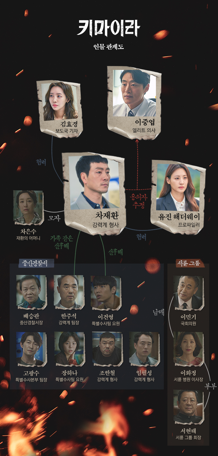 간략 줄거리는 강력계 형사 재환, 프로파일러 유진, 외과의사 중엽이 각자 다른 목적으로 35년만에 다시 시작된 연쇄폭발 살인사건, 일명 '키마이라'의 진실을 쫓는 추적 스릴러라고 합니다.