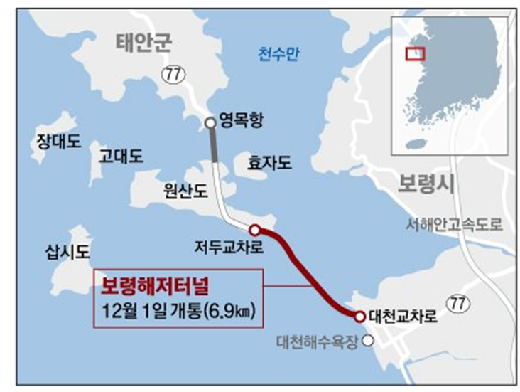 충남 보령시 대천항과 원산도를 잇는 해저터널입니다. 길이 6927m에 달해 전 세계 해저터널 중 5번째로 길다고 합니다. 2012년 11월 착공을 시작한 후, 2019년 2월과 6월 각각 상행선과 하행선이 관통되면서 양방향 굴착이 완료돼 2021년 12월 1일 개통됩니다.