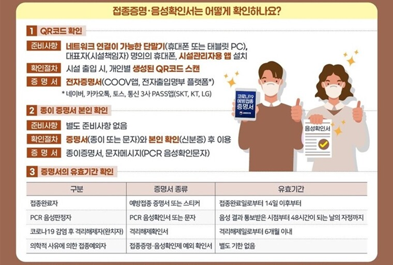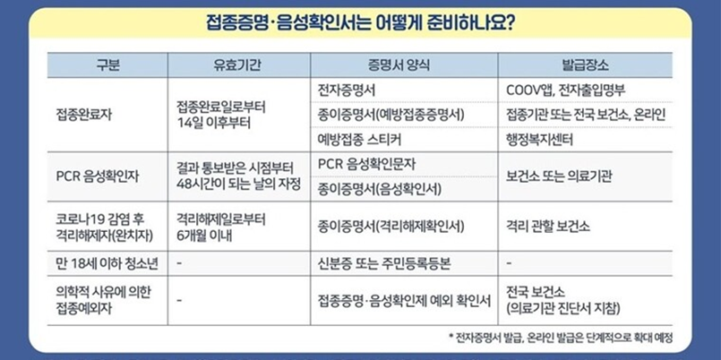 백신접종을 완료한 사람은 접종 완료일로부터 14일 이후에 접종기관, 보건소 등에서 전자 증명서나 종이 증명서, 예방접종 스티커 등으로 완료증명을 받을 수 있고, 미접종자 및 접종을 완료하지 않은 사람은 보건소나 의료기관에서 다중이용시설 방문 48시간 전에 유전자증폭검사(PCR)를 받아 음성확인서를 발급받을 수 있습니다. 감염 후 완치자는 격리관할 보건소에서 격리해제일로부터 6개월 이내에 격리해제확인서를 받을 수 있으며, 의학적 사유에 의한 접종예외자는 의료기관 진단서를 지참하여 전국 보건소에서 접종증명음성확인제 예외 확인서를 받을 수 있습니다.