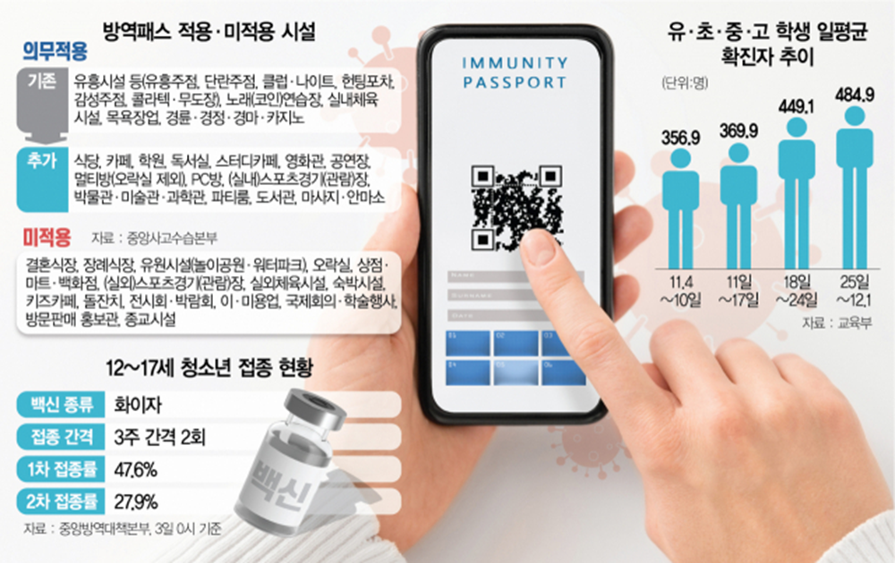 11월 하순 들어 감염자가 급증하고, 감염력이 높은 오미크론 변이가 전 세계로 확산되며 국내에서도 감염 사례가 확인되면서, 29일 특별방역대책이 마련되었습니다. 이에 따라 방역패스, 백신패스 유효기간 설정 계획도 발표되었습니다. 기본접종 완료자에 대해 방역패스를 발급할 때 6개월(추가접종 간격 5개월 + 유예기간 1개월)의 유효기간을 설정하며, 방역패스를 유지하려면 접종 간격 내에 추가 접종을 받아야 합니다. 방역패스 유효기간 제도는 12월 20일부터 시행한다. 12~18세 청소년도 8주간의 접종기간 이후인 2022년 2월부터 적용하기로 했습니다.