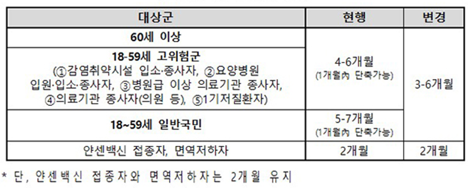 지금까지는 60세 이상 고령층 및 18~59세 고위험군은 4개월, 18~59세 일반국민은 5개월 이후로 접종 간격을 권고했습니다. 해외출국·질병치료 등 개인 사정이나 단체접종 일정상 불가피한 경우에 한해 잔여백신으로 각각 1개월씩 간격을 줄일 수 있었다.