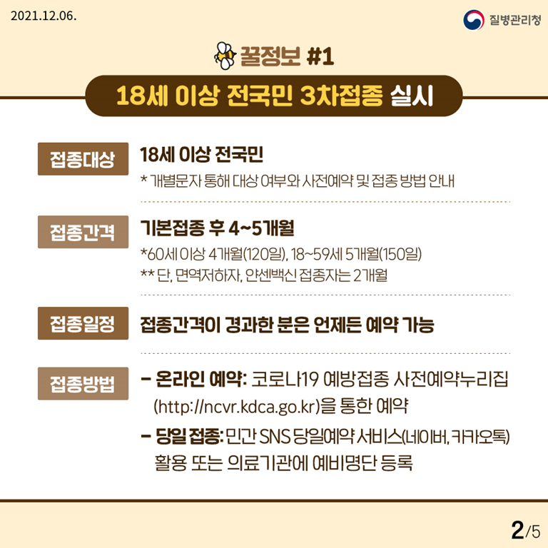 18세 이상 모든 성인의 코로나19 백신의 2~3차 접종 간격이 3개월로 단축됩니다(12.10일 발표). 그러나 방역패스, 백신패스 유효기간은 현행 6개월로 유지된다고 합니다.