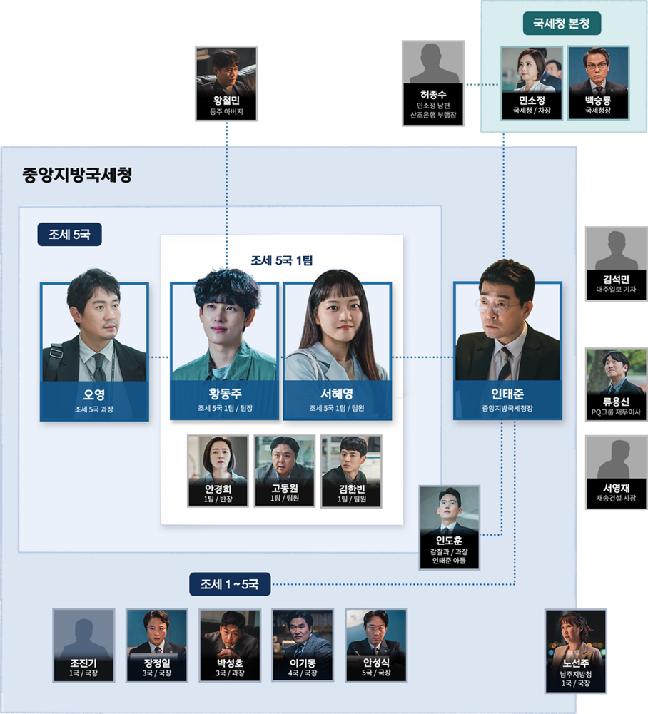 일명 ‘쓰레기 하치장’이라 불리는 조세 5국에서 일하는 다양한 인물들도 등장합니다. 오영(박용우 분) 과장은 ‘일을 안 하는 게 일’이라는 신념을 갖고 건들건들한 태도를 보이는가 하면, 다른 팀의 업무를 몰래 처리해 주고 수고비를 받는 등 독특한 캐릭터입니다. 하지만 그에게도 무언가 숨은 사연이 있음이 암시합니다.