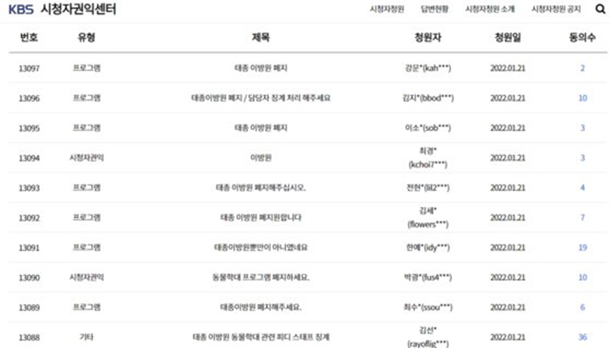 KBS 시청자권익센터에 해당 프로그램 폐지를 주장하는 글이 잇따랐고, 관련한 청와대 국민청원은 이날 오전 기준 4만여명의 동의를 얻었습니다.