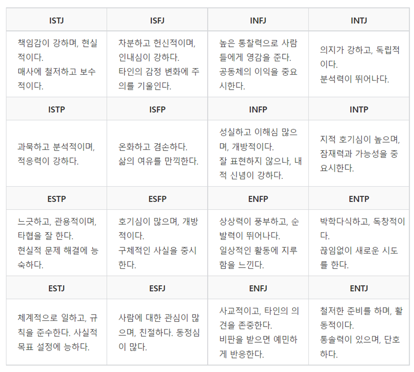 각 항목에 대해서 참고하시고, 16가지 성격유형에 대해 개인 성격에 매칭해보시면 좋을 것같습니다.