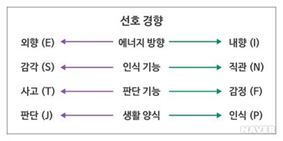 MBTI는 개인마다 태도와 인식, 판단 기능에서 각자 선호하는 방식의 차이를 나타내는 4가지 선호 지표로 구성되어 있다고 합니다. 이 4가지는 정신적 에너지의 방향성을 나타내는 외향-내향(E-I) 지표, 정보 수집을 포함한 인식의 기능을 나타내는 감각-직관(S-N) 지표, 수집한 정보를 토대로 합리적으로 판단하고 결정하는 사고-감정(T-F) 지표, 인식 기능과 판단 기능이 실생활에서 드러난 생활 양식을 보여 주는 판단-인식(J-P) 지표입니다.