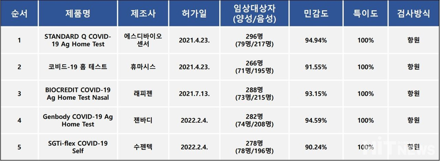 가장 최근에 허가된 젠바디 'Genbody COVID-19 Ag Home Test'와 수젠텍 'SGTi-flex COVID-19 Self' 역시 식약처 허가 민감도, 특이도 기준을 만족했다.