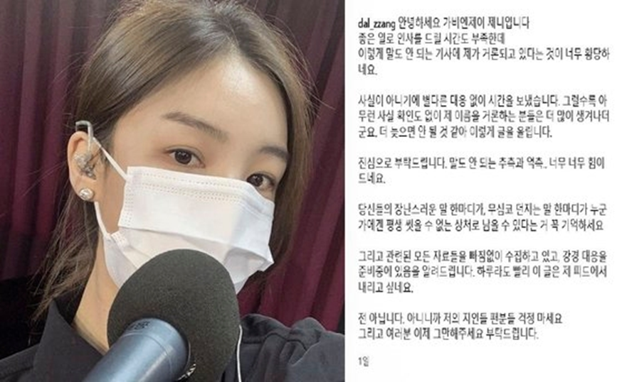 앞서 한 온라인커뮤니티에는 '남편이 연예인이랑 바람 나서 낙태까지 했어요'라는 제목의 글이 올라왔다. 글쓴이는 "결혼한 지 3개월 차다. 결혼 생활 중 남편의 양다리 사실을 알았고, 그 상대 여성이 연예인이고, 현재 임신 중이더라"며 "88년생 3인조 걸그룹 출신"이라고 주장했다. 현재 이 글은 삭제됐지만 이런 폭로를 두고 실명 추측이 난무하는 과정에서 가비엔제이 제니와서린이 언급됐다.