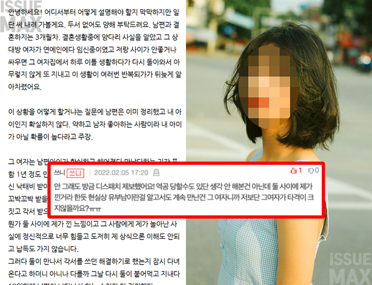 글쓴이는 “결혼한지 3개월 차다. 결혼 생활 중 남편의 양다리 사실을 알았고, 그 상대 여성이 연예인이고 현재 임신 중이더라”며 “남편은 나와 사이가 안 좋거나 싸우면 그 여성 집에서 하루 이틀 생활하다 다시 돌아와 아무렇지 않게 또 지냈고, 이 생활이 여러번 반복돼 뒤늦게 알아차렸다”고 글을 적었다.