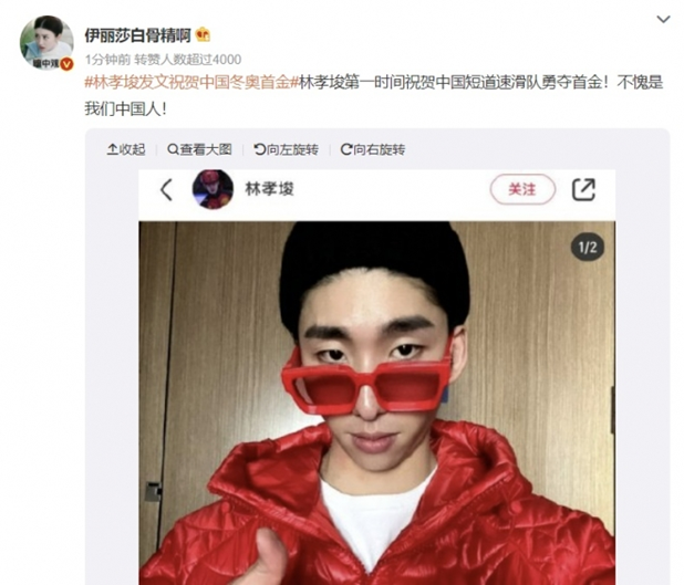 임효준은 중국이 금메달을 따자 자신의 웨이보 계정에 빨간색 점퍼와 빨간색 뿔테 안경을 착용하고 “중국 쇼트트랙의 첫 금메달 획득을 축하합니다. 올림픽의 건아들에게 박수를 보내고 응원합시다”라는 중국어 글을 남겼다.