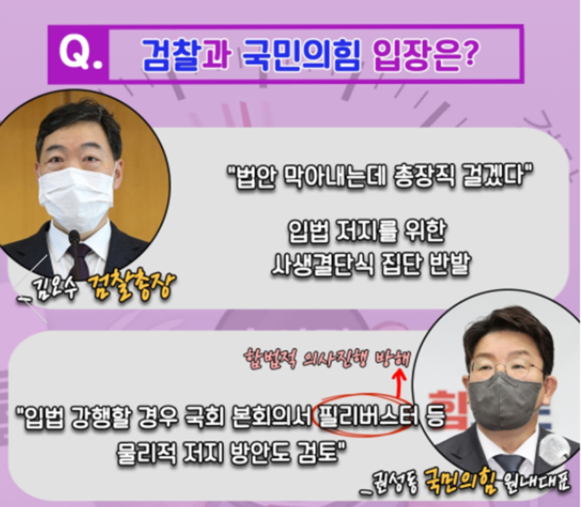 국민의힘 역시 이를 '이재명 방탄법'이라 명명하고 이를 강행할 경우 국회 본회의에서 필리버스터(합법적 의사진행 방해) 등 물리적 저지를 행사하는 방안도 검토하고 있습니다.