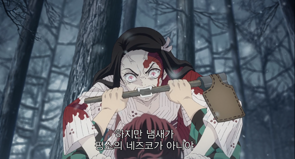 네즈코를 엎고, 눈내리는 산속을 달리던중.. 이상해진 네즈코에게 위협을 당합니다. 마치 드라큘라에 물려 드라큘라가 된것처럼 네즈코는 혈귀가 되어있었습니다. 동생에게 죽임을 당할수도 있는 절망적인 상황 속에서.. 동생은 인간의 생각이 남아있는 것처럼 진정하게 됩니다. 이로써.. 주인공의 목표는 가족들의 복수와 혈귀가 되어버린 동생을 다시 인간으로 돌리는 방법을 찾아 나섭니다. 혈귀는 사람을 잡아먹고, 사람을 잡아먹을 수록 강해진다는 요괴들로 설정되어 있습니다. 혈귀는 상처를 입어도 빠르게 회복하고, 목이 잘려도 죽지 않고, 신체능력도 인간보다 훨씬 빠르고, 힘이 쎕니다.