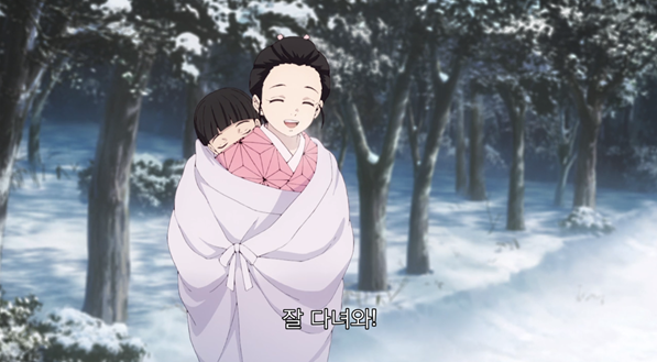 어느날 탄지로는 마을 사람들을 돕다가 밤늦게 집에 돌아가게 됩니다. 마을 사람이 늦은밤에 탄지로를 걱정하며 자기 집에서 하루밤 묵고 가라며 재워줍니다. 다음날 집으로 돌아갔을때, 탄지로는 경악하게 됩니다.. 어머니와 동생들이 참혹하게 살해당했기 때문입니다.. 유일하게 숨이 붙어있던 여동생 네즈코를 등에 엎고, 서둘러 달려갑니다.