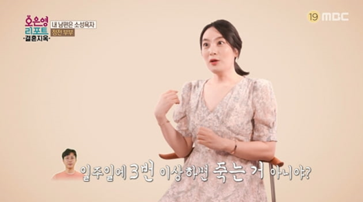 MBC 오은영 리포트 결혼지옥에서 밝힌 바로는 성욕이 많은 편으로 남편과의 욕구 차이로 불만이 있다고 합니다. 하지만 해당 방송의 출연 부부들이 상당히 심각한 문제들을 안고 있었던 것에 반해 다소 귀여운 모습으로 비춰졌다고 합니다.