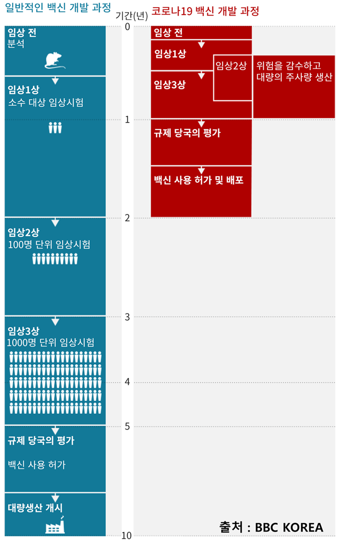 일반 백신 개발 과정은 소수를 대상으로 시간을 넉넉히 가지면서 개발이 되네요.