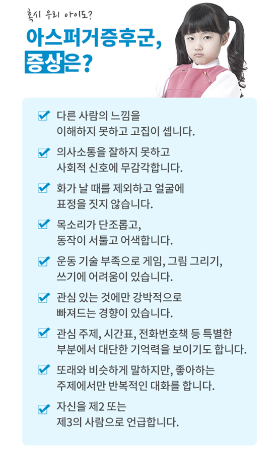 아스퍼거 장애를 가진 아동은 대개 다른 사람과 있는 것을 좋아하고 말하기를 좋아하지만, 대화가 효과적으로 이루어지기 어려운 증상들을 가지고 있다고 합니다. 특히 말투에 운율이 부족한 것이 특징이고, 대화를 나누다 보면 말투나 내용이 과장되어 있다는 인상을 주며, 눈치가 없다는 평가를 받기도 합니다. 집착하고 있는 관심 분야에 집중되어 있고, 의사소통 중에 얼굴 표정과 몸짓을 사용하는 경우가 적은 편입니다.