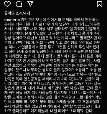그러자 다시 에릭이 입장을 밝혔다. 그는 "내가 스케줄 조정과 콘서트 대관을 진행해왔는데 제작진과의 소통을 모르겠느냐"며 "(김동완을 제외한) 5명이서 회의를 한게 허다하다"고 반박했다고 합니다.