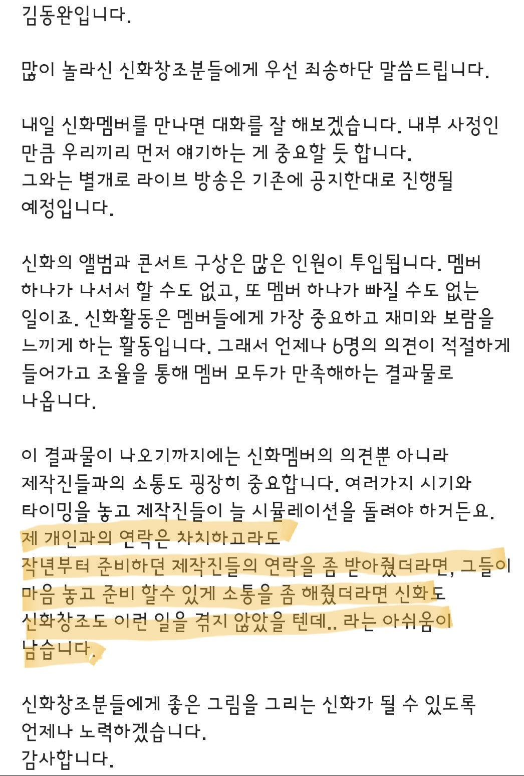 논란이 거세지자 김동완은 SNS을 통해 "신화 멤버들 만나면 대화를 잘 해보겠다"면서도 "제 개인과의 연락은 차치하고라도 작년부터 준비하던 제작진들의 연락을 좀 받아줬더라면, 그들이 마음 놓고 준비할 수 있게 소통을 좀 해줬더라면 신화도, 신화창조도 이런 일을 겪지 않았을 텐데라는 아쉬움이 남는다"고 에릭을 비판했습니다.