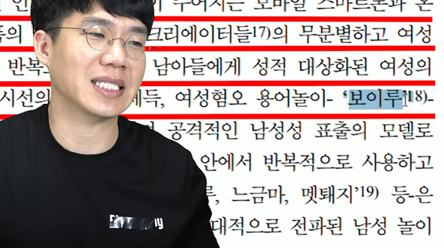 '보이루'는 '보겸 하이루'라는 의미로, 평소 보겸이 자주 쓰는 것으로 알려졌는데요. 논문에는 "보겸이라는 유튜버에 의해 전파된 '보이루'란 용어는 '보X+하이(Hi)'이 합성어로 여성혐오용어 놀이의 유행어처럼 사용됐다"고 설명되어 있었습니다.