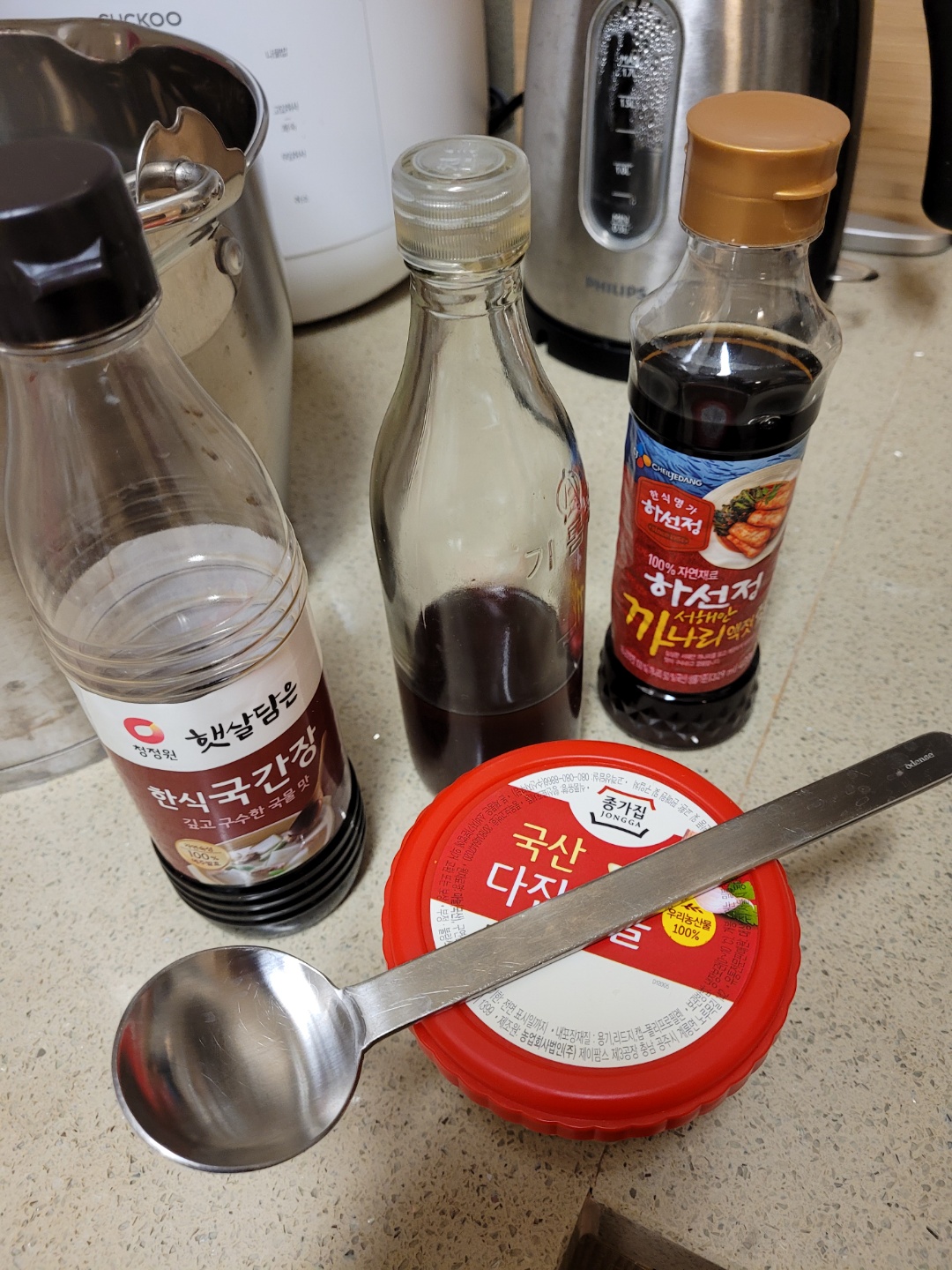 소고기(부위 상관없음, 대충 본인이 원하시는 양), 국간장(대충 밥숟가락 기준 2스푼), 참기름(2스푼), 다진마늘(1/2스푼), 까나리액젖(1스푼), 물 4인분 기준 1000ml (대충 종이컵이 200ml입니다. 비슷한 사이즈의 물컵을 5번 부으면 되겠죠!? ^^;)