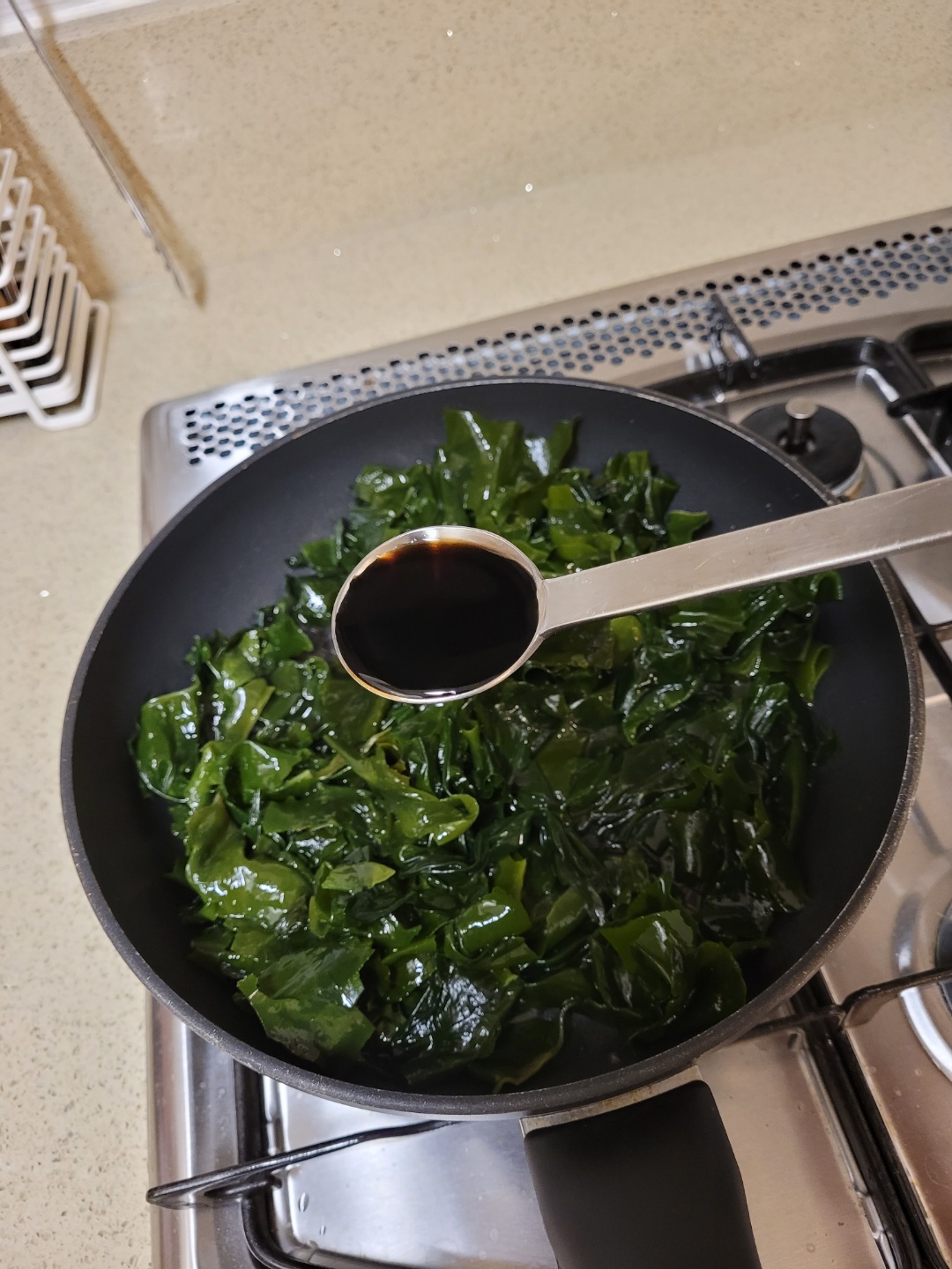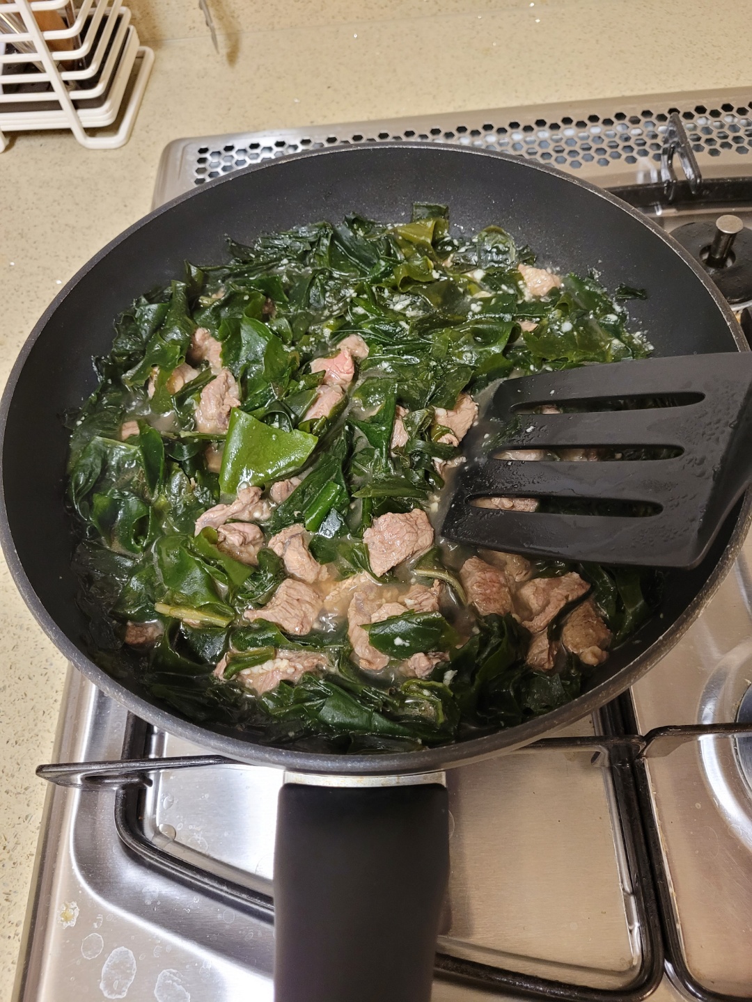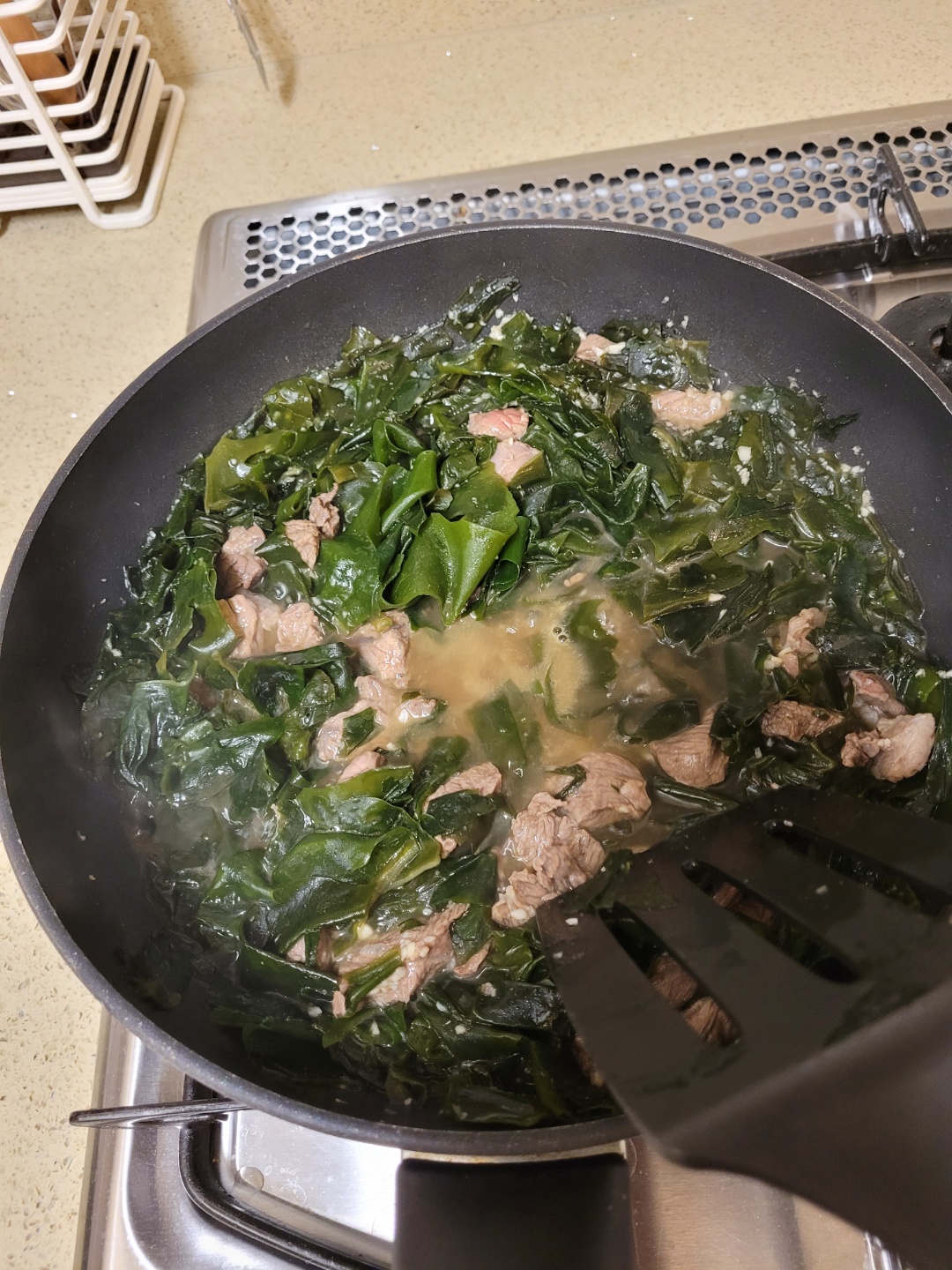 4) 미역이 물을 먹고 있고, 물이 흥건할 껍니다. 이 물들이 증발되고, 국간장, 참기름, 다진마늘 등이 미역과 소고기에 스며들도록 쫄입니다. 쫄이는 과정에서 잘 익게 됩니다.