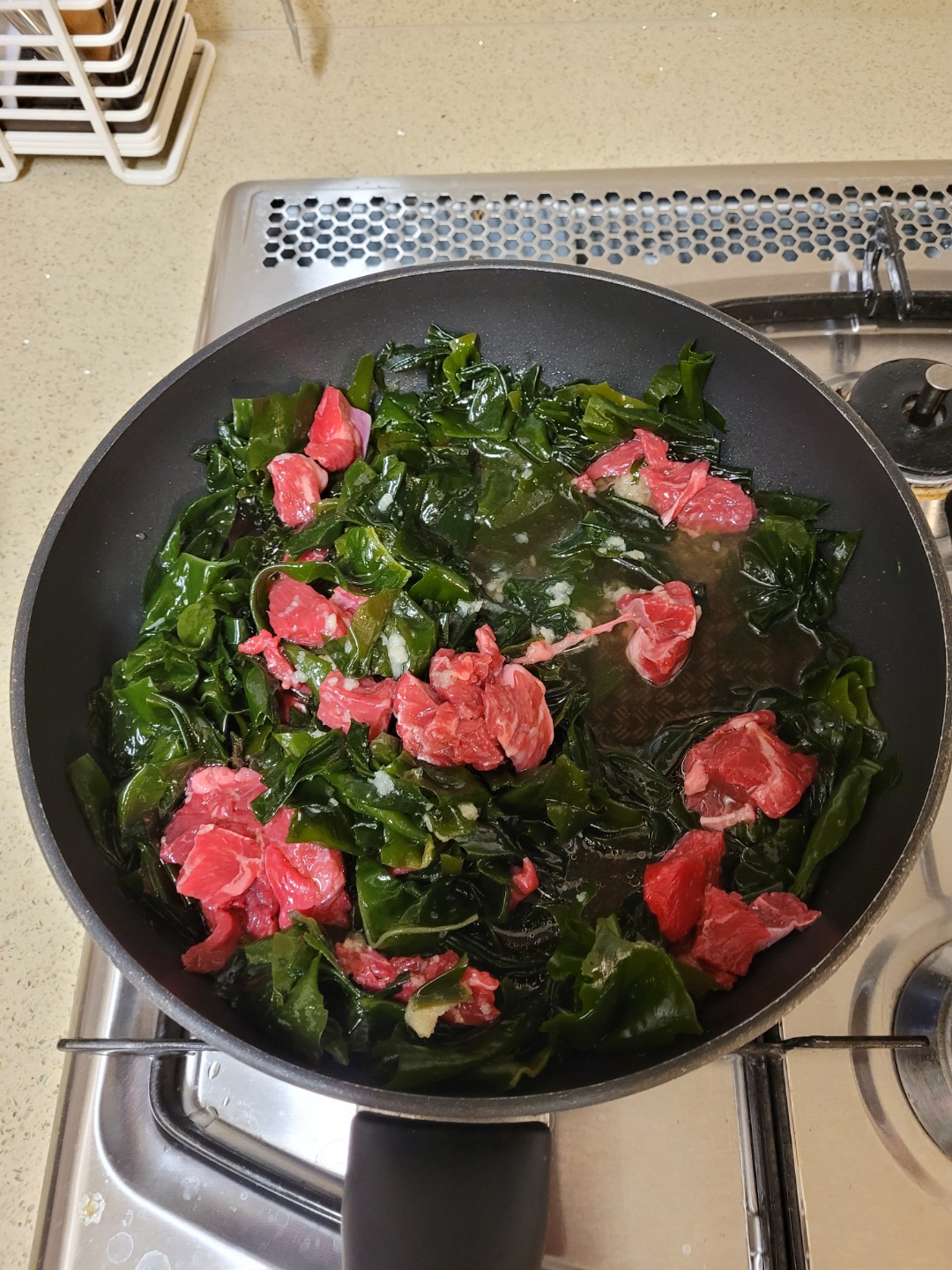 2) 미역을 건저, 소고기와 함께 후라이팬에 올린다.