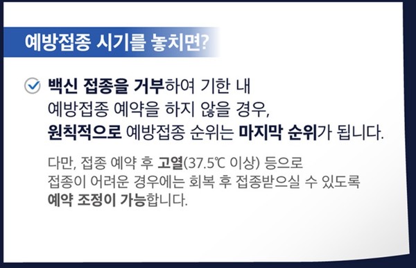 "원치 않으면 거부해도 된다. 코로나19 예방과 확산을 막기 위해 적정 인구 수 이상 접종이 필요하지만, 개인의 건강상태 등을 고려해 본인 동의 하에 접종한다. 만약 예약 이후 접종 당일 섭씨 영상 37.5도 이상 열이 나거나 몸 상태가 좋지 않은 경우 예약을 변경하고 회복 이후 접종하면 된다. 하지만 자기 차례가 돌아왔을 때 특정 백신 제품을 맞고 싶다는 등의 이유로 백신 접종을 거부하고 기한 내 예약을 하지 않으면 접종 순위가 맨 뒤로 밀린다."